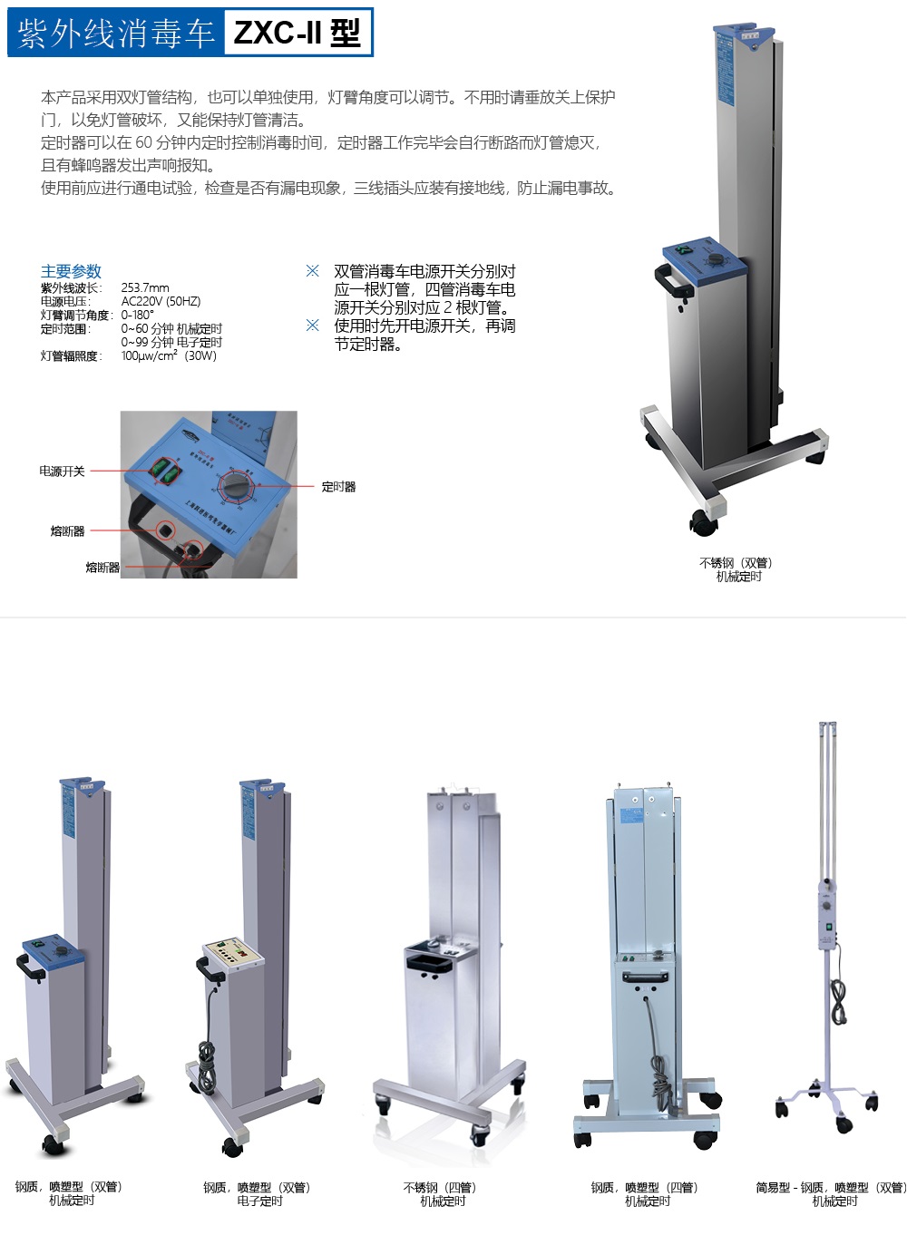產(chǎn)品采用雙燈管結(jié)構(gòu),也可以單獨使用,燈臂角度可以調(diào)節(jié)。不用時請垂放關(guān)上保護(hù)門,以免燈管破壞,又能保持燈管清潔。