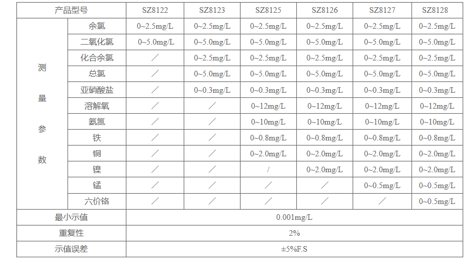 可同時(shí)測(cè)量 5 種參數(shù):余氯、總氯、 化合余氯、亞硝酸鹽、二氧化氯等離子濃度